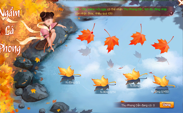 • Trong thời gian hoạt động, bằng hữu online, và nhận điểm năng động có thể nhận thưởng Thu Phong Dẫn. Dùng 4 hoặc 8 thu phong dẫn để nhận hoạt động thưởng ngẫu nhiên.
